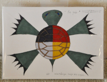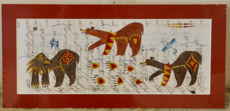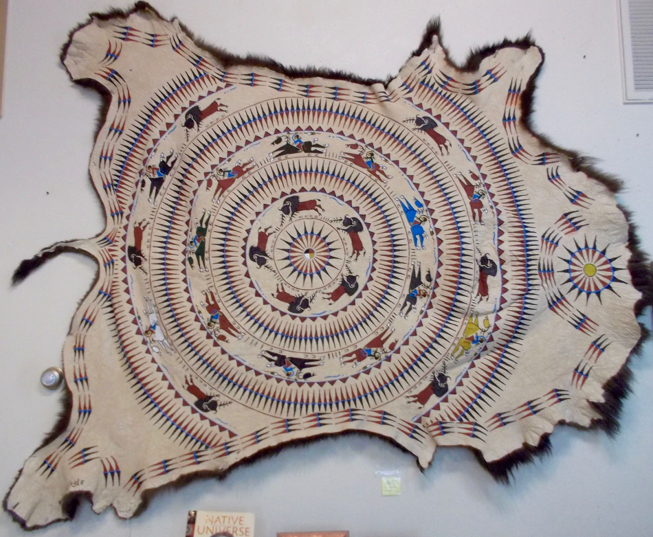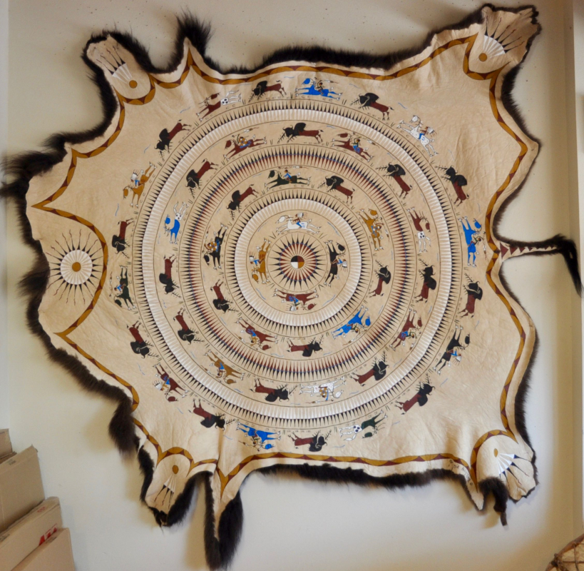 Sonja has done many hide paintings, this is just a small sample of her work from the past. To see any current hide paintings we have just visit our Etsy site. She paints Buffalo Robes. Elk hides, and Deer hides. These are traditional Lakota designs, mixed with her own art. She uses a permanent ink on these,